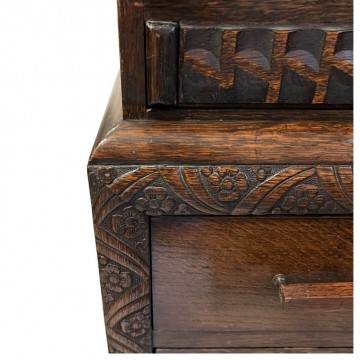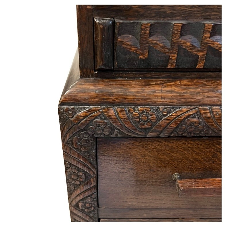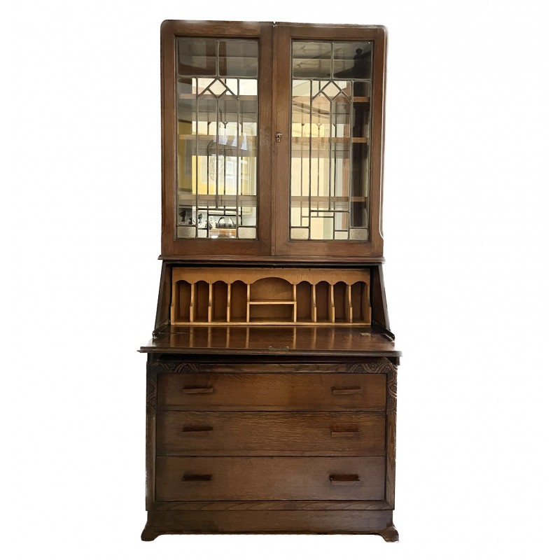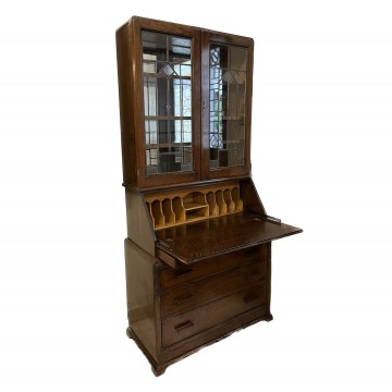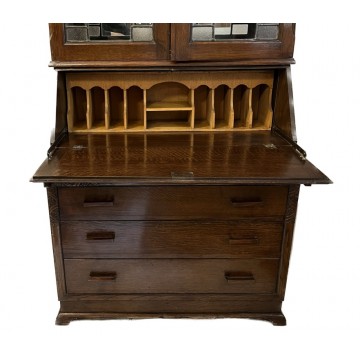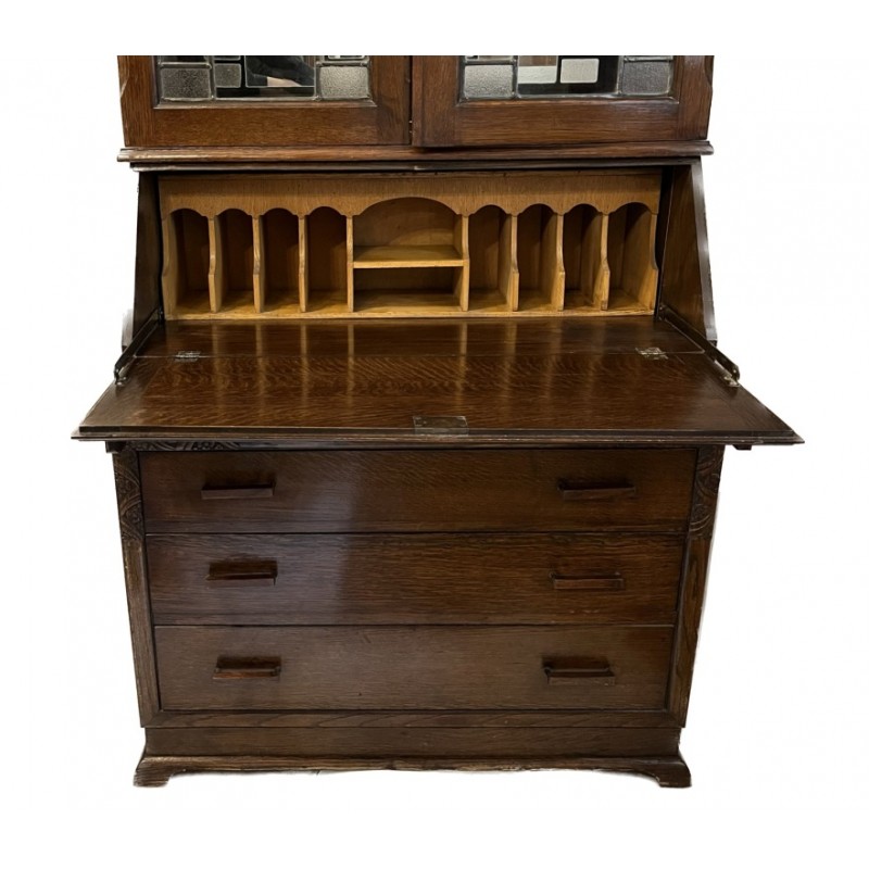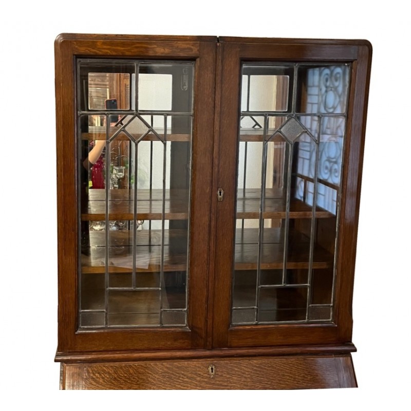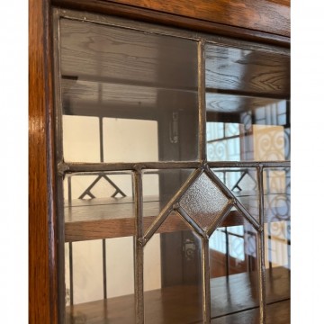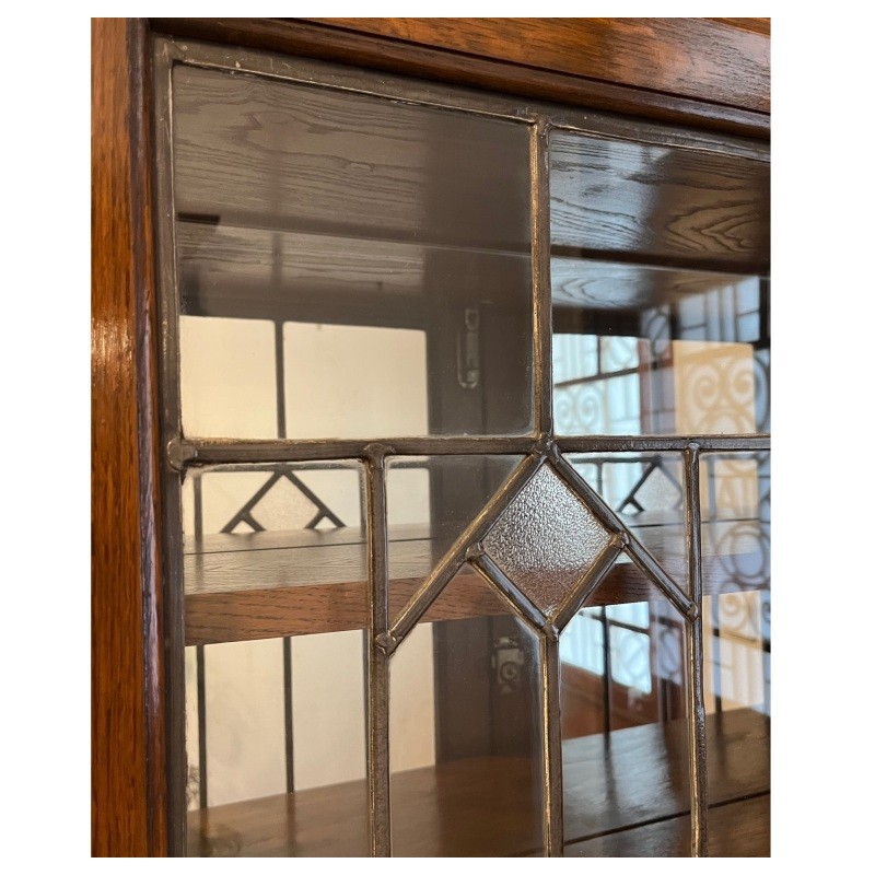 The top has 2 leadlight doors, 3 adjustable oak shelves and mirror back. Can be used as bookcase or showcase.